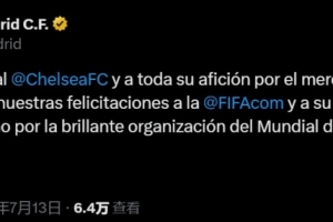 体育资讯7月14日讯 在切尔西3-0击败巴黎夺得世俱杯冠军后,皇马第一时间通过社交媒体表达了祝贺。