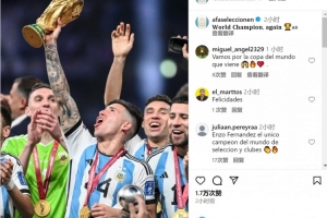 阿根廷队官方社媒晒出恩佐2022年世界杯夺冠后举起大力神杯的照片,配文:“再次赢得世界冠军。”