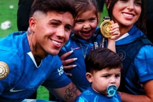 恩佐赛后与女友、两个孩子合影留念,庆祝夺冠,并在社交媒体上转发合照。