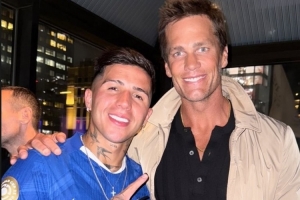 NFL传奇巨星汤姆-布雷迪来到现场观看比赛,恩佐社媒晒出与布雷迪的合照,并配上了山羊(GOAT)的表情符号。
