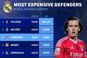 皇马队史引进后卫转会费排名: