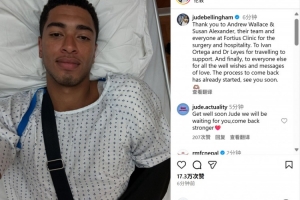 贝林厄姆写道:“感谢安德鲁-华莱士、苏珊-亚历山大及其医疗团队,以及Fortius诊所的所有工作人员,感谢热情接待并成功完成手术。还要感谢伊万-奥尔特加和莱耶斯医生特意前来支持。最后,感谢所有人的美好祝愿。我已经开始了复出进程,很快就会与大家见面。”