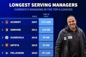体育资讯7月21日讯 德转统计了五大联赛教练当前执教时间数据,德甲海登海姆主帅弗兰克-施密特带队超17年居首,西蒙尼、瓜迪奥拉、阿尔特塔分列二三四位。
