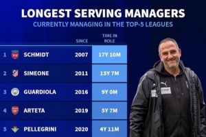 体育资讯7月26日讯 《转会市场》统计了五大联赛当前执教同一球队最长时间榜,海登海姆的主帅施密特居首。