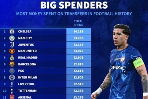 体育资讯7月29日讯 《转会市场》统计了历史转会费支出情况,切尔西独自领跑,前11名中英超独占6席。