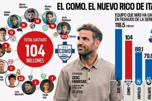 体育资讯8月6日讯 据西媒《阿斯报》发文表示,法布雷加斯执教的科莫今夏已经花费1.04亿欧签下10名新球员,转会支出仅次于尤文,位列意甲第二多。在印尼富豪的支持下,科莫正在成为意甲的一支重要力量。