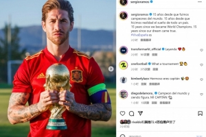拉莫斯社媒晒出与大力神杯的合照,配文:“15年前我们成为世界冠军,15年前我们梦想成真。”