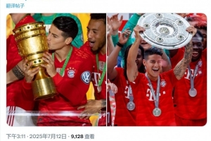拜仁官方社媒晒出J罗效力球队时期的捧杯照片,配文:“祝J罗34岁生日快乐!”